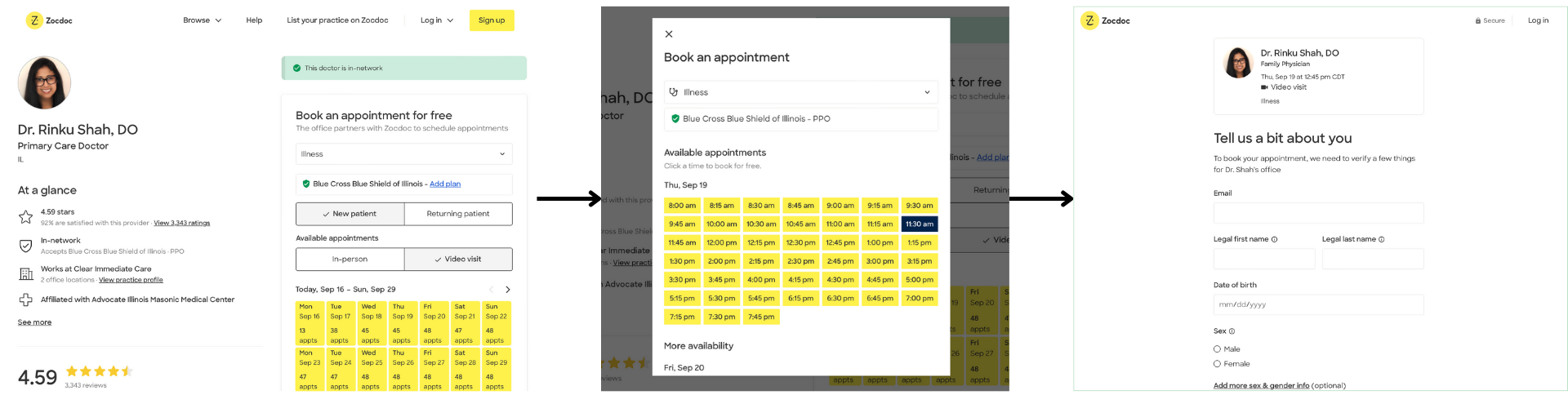 - Flow 2, also below, requires the user to select a provider, select a date and time for an appointment, and fill out the appointment form
